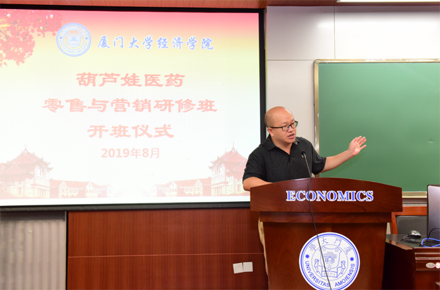 在开班仪式上,廖景峰主任首先代表厦门大学经济学院热烈欢迎PG医药零售与营销研修班的学员到厦大学习,并就厦门大学及经济学院的相关情况进行了介绍。他说,PG学员走进厦大就是厦大的校友,希望未来的日子能够关心、支持母校的发展,多提宝贵意见,同时他也祝大家在厦大学习期间学有所成、学有所获。